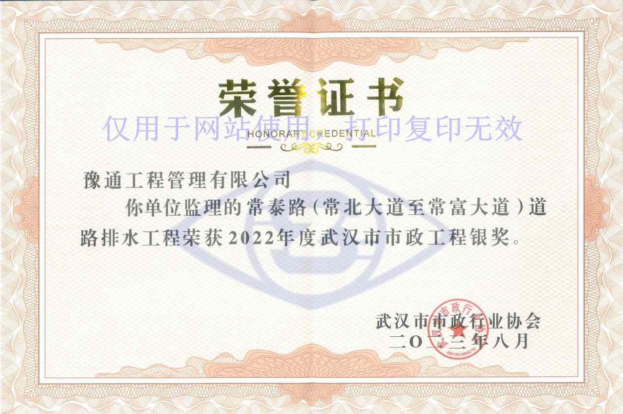 近日,武漢市市政行業協會頒發了2022年度武漢市市政工程獎項,公司監理的常泰路(常北大道至常富大道)道路排水工程榜上有名。